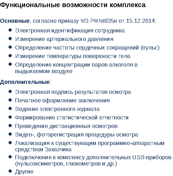 Комплекс «АМО» предназначен для автоматизации профессиональных медицинских осмотров, оперативного анализа полученных данных и их авторизованной передачи в специализированную медицинскую информационную систему с последующей автоматической обработкой. Комплекс состоит из передвижной металлической стойки М18А, тонометра ТМ2655Р(TM2655P), контроллера НКР18АМО и прикладного программного обеспечения. Использование дополнительных модулей определения температуры поверхности тела, содержания паров алкоголя в выдыхаемом воздухе, автоматической видео-пуппилометрии и фото-видеорегистрации процессов измерения позволяет сформировать эффективную автоматизацию профессиональных медицинских осмотров для нужд учреждения, включая предрейсовые/предсменные и послерейсовые/послесменные осмотры с применением сертифицированных дистанционных технологий.